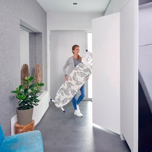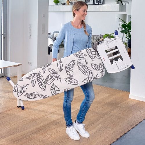 Ultra-light and stable with extra-large ironing surface, perfect for using a steam station. The Leifheit Air Board Express L Solid has everything a modern ironing board needs. It is lighter than any expanded metal ironing board, but completely stable, and has an extra-large ironing surface with a cover made from pure perforated cotton. The cover lets the steam from the iron through and ensures optimum moisture absorption. Setting up and putting away the Air Board Express L Solid is simple with the ironing surface that’s made with an ultra-light special plastic. The 130 x 38cm ironing surface rests on a 35mm thick, completely stable tubular frame. It can be raised to a height of 100 cm, adjusting to suit all heights and working levels. The ironing board has a solid steam station tray made of metal fitting all commonly used types of steam station with a secure rest for conventional irons. Shirts or jackets can be hung on the clothes hanger holder on the tray after ironing. It includes a cable flex holder to stop power cables getting in the way of your ironing.- Ideal for steam stations thanks to the steam permeable cover made of perforated cotton