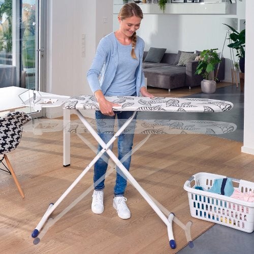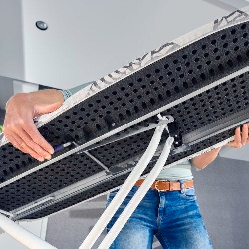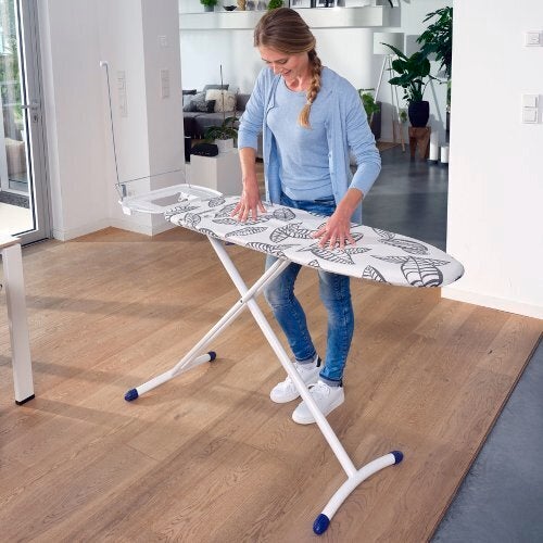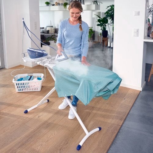 The ironing board is equipped with a large iron rest for the safe standing of the steam iron station. In addition, the cover made from pure, perforated cotton ensures optimum steam penetration.
