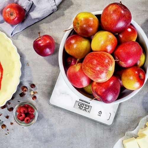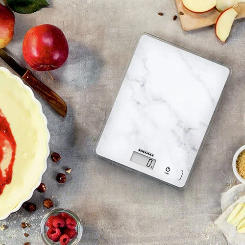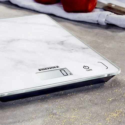 With its high weighing capacity of 5 kg and 1 g increment precision, the Soehnle Page Compact 300 Marble digital kitchen scale is suitable for everyday use. Its modern design makes it a special gem in your kitchen. The natural marble look evokes a stylish presence. Thanks to its chic appearance you can keep the kitchen scale on your surface or hang it on the wall – it will blend beautifully into the room. The 12 mm LCD display is very practical, making the digits easy to read. The scale is easy to use with the Soehnle patented sensor touch. Unlike the versions with keys, the model does not have any buttons which could gather dirt. This makes it easy to clean. Naturally, the household scale is fitted with an automatic switch-off function and therefore making the scale very energy efficient. The tare weighing function allows ingredients to be weighed conveniently in one bowl when baking and cooking. The Page Compact 300 Marble digital kitchen scale is provided with anti-slip feet so it will remain stable on its surface when in use The extra-slim, compact design means it can be stored away in a space-saving way or hung on the wall. Batteries are included so your digital scale is ready for use immediately. These will last for over two years if you use the scale twice a day. The battery compartment is childproof, secured firmly with screws.- High weighing capacity of 5 kg and 1 g increment precision