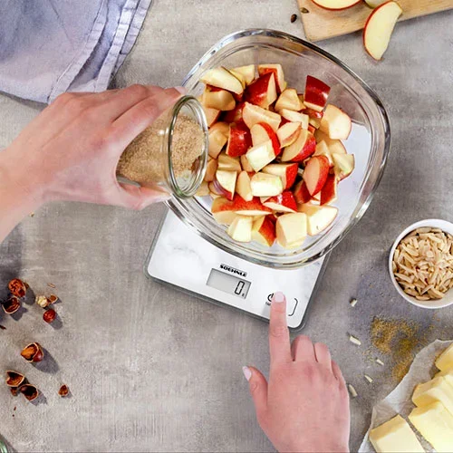 - Practical tare function for convenient weighing of different ingredients in one bowl