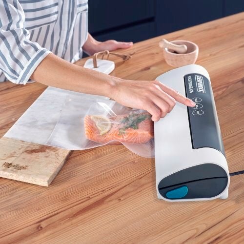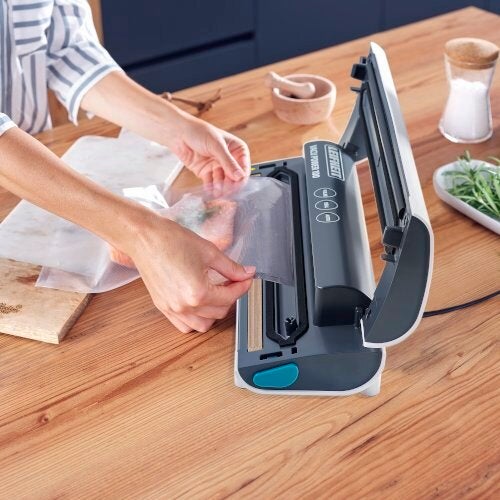 Electrical and fully automatic vacuum sealing of food with the Leifheit Vacu Power 100 vacuum device. For use with fruit, meat, fish or vegetables – vacuum sealing keeps the contents fresh five times longer. And naturally without the need for preservatives. The sonic sensor touch display makes the Leifheit Vacu Power 100 intuitive and easy to use. The pulse function controls the individual vacuum strength. This makes the device ideal for delicate foods. If required, separate sealing is also possible to make a vacuum pouch from a vacuum roll itself, for example. The Vacu Power 100 vacuum device also has a function for vacuum sealing containers. These vacuum containers and the vacuum tube needed for this can be purchased separately from Leifheit. To ensure safe use, the device has an electronic temperature control which prevents the seam from melting. It is also easy to store thanks to its compact size. Ten Leifheit vacuum pouches (20 x 30 cm) are included with the vacuum device. All branded vacuum rolls and pouches up to a maximum width of 30 cm can be used.- Efficient vacuum sealing thanks to a pump performance of four litres per minute
