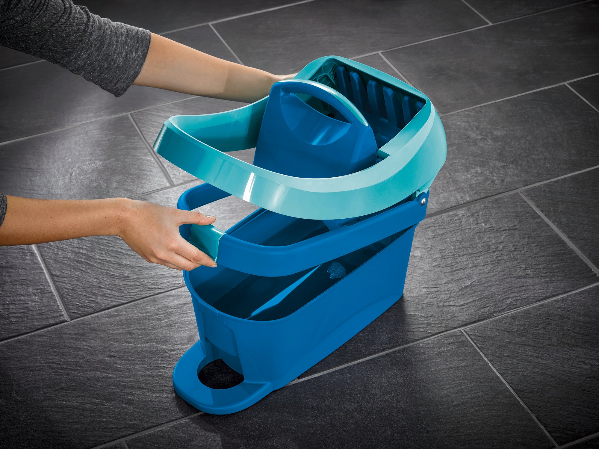 The ideal solution for cleaning large surfaces quickly. The Wiping Cloth Press consists of a compact 8 litre capacity bucket and a press attachment, which can be easily and comfortably operated by foot. The Wiping Cloth Press is suitable for the Profi Floor Mop. This is how it works: The mop cover is removed from the handle using the foot control and placed in the press. The press is then operated by pressing it with the foot. Done. The mop cover is so dry, it could have been wrung out by hand...and all without having to put your hands in dirty water or bend over. The press attachment is fitting with a practical handle so the bucket can be easily transported during cleaning. The Profi Floor Mop is the perfect companion to the Wipling Cloth Press Profi, having a cleaning area of 42 cm, a 360° swivel joint and foot control.- Thorough cleaning for tiled and stone floors without bending or placing hands in dirty water